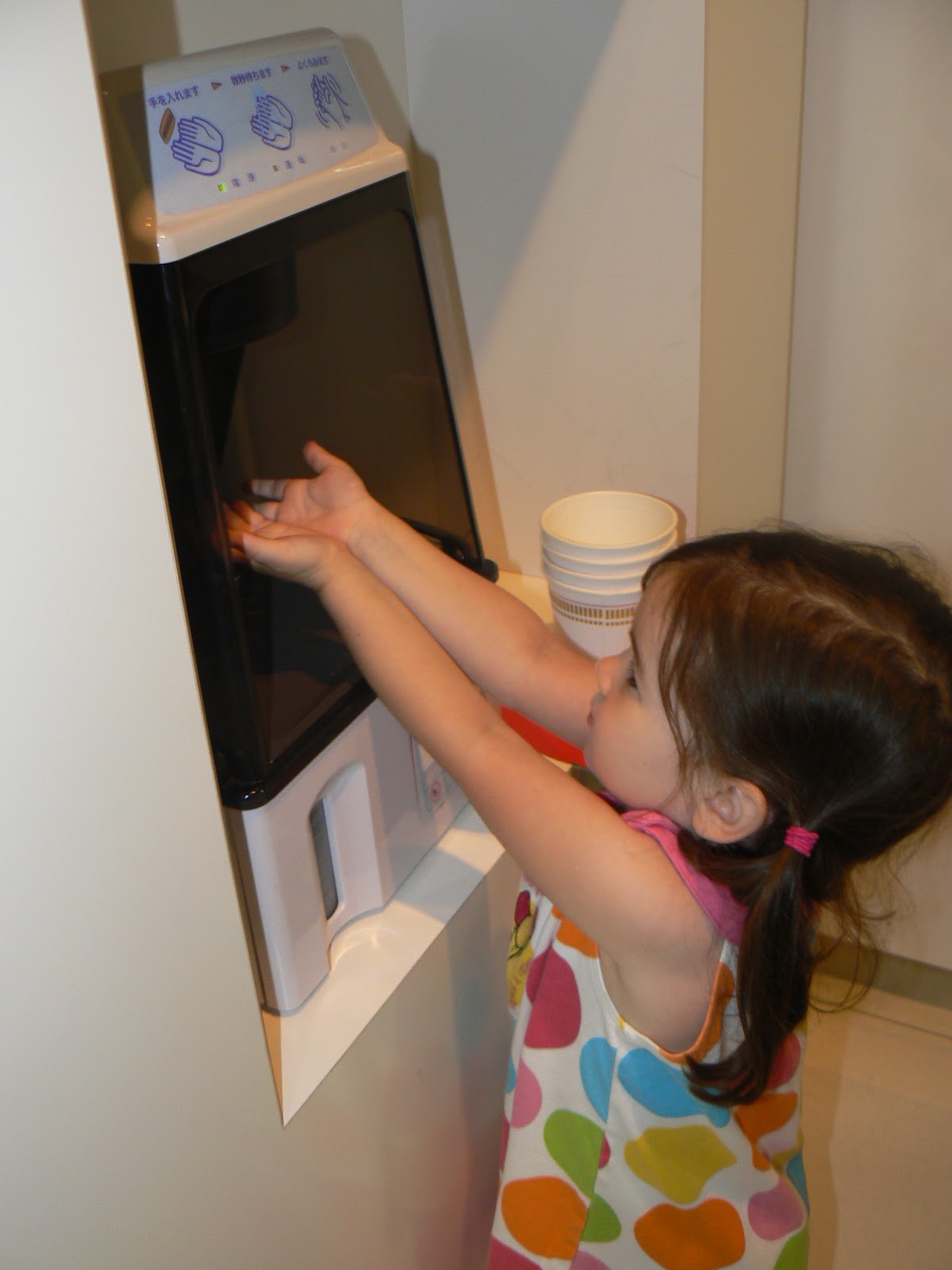 And before we left, some of the employees offered to let the girls get their picture taken with the little chicken that is the character mascot for the Cup of Noodle.